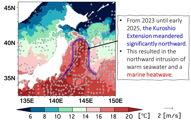 From 2023 until early 2025, an extremely unusual situation occurred in the ocean to the east of Japan (Fig. 1). The Kuroshio Extension, which is a warm ocean current extending from the Kuroshio Current off the main island of Japan, meandered significantly northward. Consequently, warm subtropical seawater intruded northward, and record-breaking high sea surface temperature was observed. Such conditions of high sea surface temperature are recently referred to as ‘marine heatwaves’. The other column by Shusaku Sugimoto, entitled ‘The Kuroshio Extension has reached off Aomori Prefecture – What has happened off Sanriku since 2023?‘, provides a detailed explanation of this unusual oceanic situation.