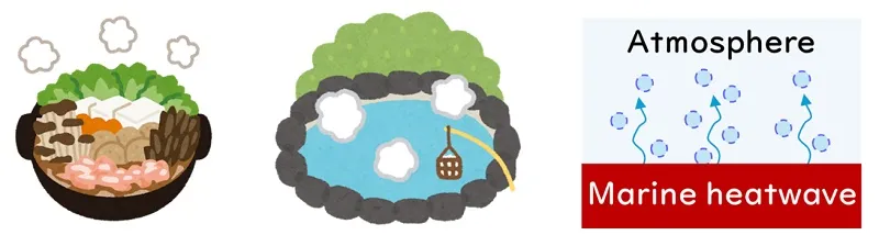 In regions where marine heatwaves occur, the supply of moisture and heat from the ocean to the atmosphere increases. If you think of hot pot dishes or a steaming hot bath, then this phenomenon will make intuitive sense (Fig. 2). Water vapor is the source of rain and snow. Therefore, marine heatwaves may contribute to the occurrence of heavy rainfall and snowfall by increasing the amount of water vapor in the atmosphere.
